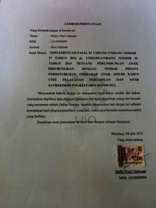 Sabrani, Melly Putri (2025) Implementasi pasal 81 Undang-Undang nomor 17 tahun 2016 Juncto Undang-Undang nomor 35 tahun 2014 tentang perlindungan anak dihubungkan dengan tindak pidana persetubuhan terhadap anak: Studi kasus Unit Pelayanan Perempuan Dan Anak Satreksrim Polrestabes Bandung. Sarjana thesis, UIN Sunan Gunung Djati Bandung.