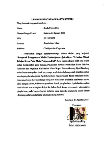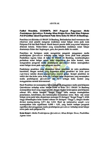 Muzakkiy, Fadhel (2025) Pengaruh penggunaan media pembelajaran Quizwhizzer terhadap minat belajar siswa pada mata pelajaran PAI: Penelitian quasi experiment pada siswa kelas XI SMAN 26 Bandung. Sarjana thesis, UIN Sunan Gunung Djati Bandung.
