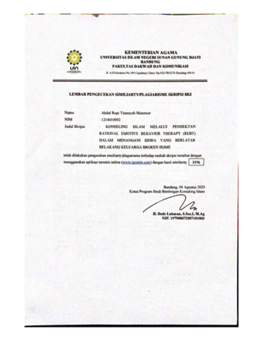 Munawar, Abdul Ropi Titansyah (2025) Konseling Islam melalui pendekatan Rational Emotive Behavior Therapy (REBT) dalam menangani siswa yang berlatar belakang keluarga Broken Home di SMK Nuurul Muttaqiin Garut. Sarjana thesis, UIN Sunan Gunung Djati Bandung.