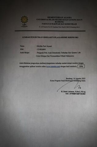 Jayanti, Meritha Putri (0008) Pengaruh pola asuh demokratis terhadap fase quarter life crisis ditinjau dari permasalahan pribadi mahasiswa: Penelitian terhadap mahasiswa Institut Darul Huffadz Indonesia. Sarjana thesis, UIN Sunan Gunung Djati Bandung.