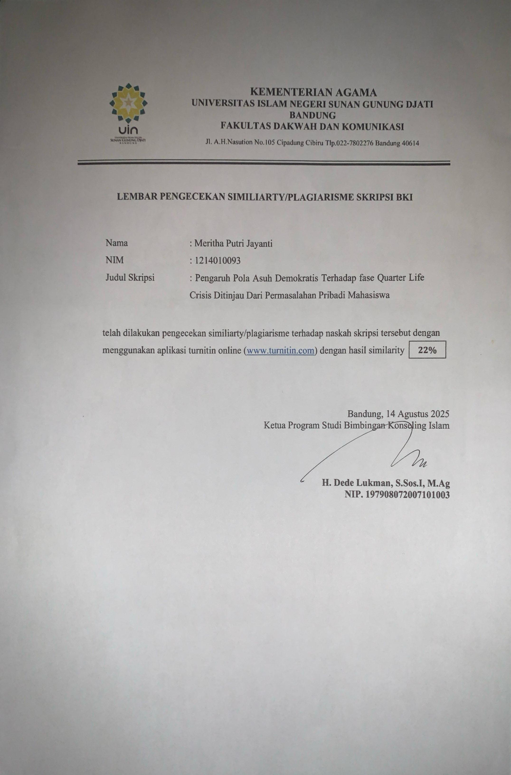 Quarter life crisis merupakan fase transisi menuju dewasa awal yang ditandai dengan ketidakpastian arah hidup, krisis identitas, kecemasan, dan keraguan dalam mengambil keputusan. Kondisi ini berdampak pada kesehatan mental dan perkembangan psikososial mahasiswa. Salah satu faktor yang berperan dalam mengurangi gejala tersebut adalah pola asuh demokratis, yang menyeimbangkan kebebasan dengan pengawasan melalui komunikasi terbuka, dukungan emosional, dan kontrol konsisten. Penelitian ini bertujuan menguji pengaruh pola asuh demokratis terhadap fase quarter life crisis pada mahasiswa Institut Darul Huffadz Indonesia. Fokus penelitian adalah mengetahui sejauh mana pola pengasuhan yang seimbang antara kontrol dan dukungan orang tua memengaruhi tingkat kecemasan, kebingungan, dan ketidakpastian mahasiswa. Landasan teori mengacu pada konsep pola asuh demokratis menurut Baumrind (1971) dengan empat indikator: responsif terhadap anak, dorongan positif, kehangatan emosional, dan kontrol konsisten. Teori quarter life crisis dari Robbins & Wilner (2001) digunakan dengan tujuh indikator, termasuk keraguan, krisis identitas, dan kesulitan menyeimbangkan hidup. Metode penelitian menggunakan pendekatan kuantitatif dengan desain kausalitas dan analisis regresi linear sederhana. Populasi adalah seluruh mahasiswa tingkat akhir berjumlah 30 orang melalui teknik sensus. Instrumen berupa kuesioner skala Likert berdasarkan indikator variabel penelitian, dianalisis dengan uji validitas, reliabilitas, dan regresi menggunakan SPSS. Hasil penelitian menunjukkan pola asuh demokratis berpengaruh signifikan terhadap quarter life crisis, dengan arah hubungan negatif, nilai signifikansi 0,000, dan kontribusi 48,2%. Semakin tinggi pola asuh demokratis, semakin rendah tingkat quarter life crisis. Sisanya 51,8% dipengaruhi faktor lain seperti dukungan sosial dan kondisi ekonomi.