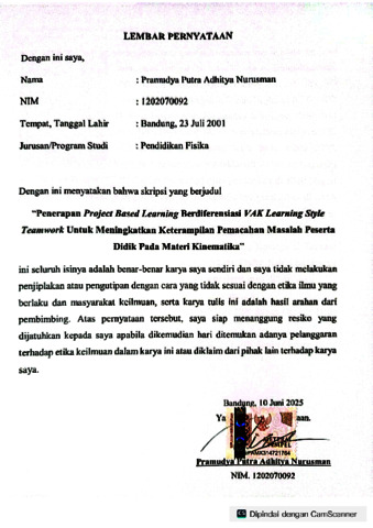 Nurusman, Pramudya Putra Adhitya (2025) Penerapan Project Based Learning berdiferensiasi VAK Learning Style Teamwork untuk meningkatkan keterampilan pemecahan masalah peserta didik pada materi Kinematika. Sarjana thesis, UIN Sunan Gunung Djati Bandung.