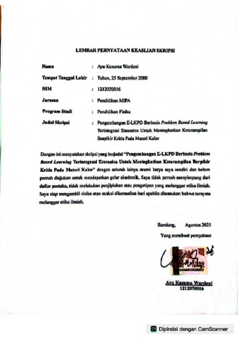 Wardani, Ayu Kusuma (2025) Pengembangan E-LKPD berbasis Problem-Based Learning terintegrasi Etnosains untuk meningkatkan keterampilan berpikir kritis peserta didik pada materi kalor. Sarjana thesis, UIN Sunan Gunung Djati Bandung.