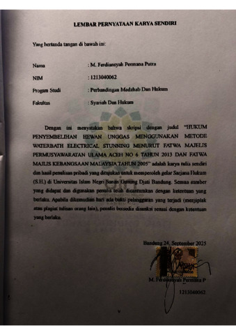 Permana p, M Ferdiansyah (2025) Hukum penyembelihan hewan unggas menggunakan metode Waterbath Electrical Stunning menurut fatwa majelis permusyawaratan ulama Aceh no.6 tahun 2013 dan fatwa majlis kebangsaan Malaysia tahun 2005. Sarjana thesis, UIN Sunan Gunung Djati Bandung.