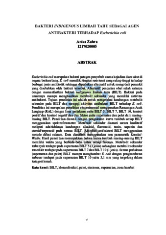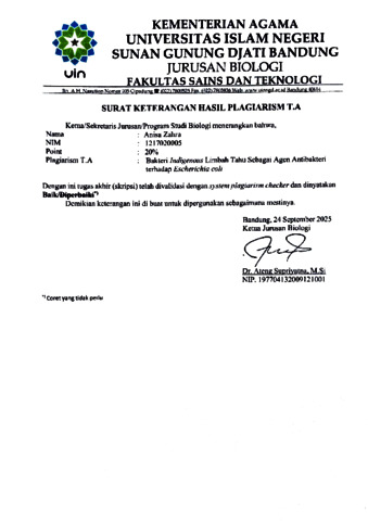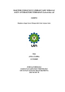 Zahra, Anisa (2025) Bakteri indigenous limbah tahu sebagai agen antibakteri terhadap Escherichia coli. Sarjana thesis, UIN Sunan Gunung Djati Bandung.