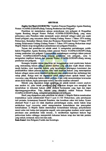 Penelitian ini menjelaskan adanya permohonan izin poligami di Pengadilan Agama Bandung dengan Nomor Perkara 4124/Pdt.G/2024/PA.Badg. yang mana perkaranya yaitu Pemohon tidak memenuhi syarat alternatif sebagai salah satu aspek formil poligami yang tercantum dalam Undang-Undang Nomor 1 Tahun 1974 tentang Perkawinan, Kompilasi Hukum Islam dan Peraturan Pemerintah Nomor 9 Tahun 1975 tentang Pelaksanaan Undang-Undang Nomor 1 Tahun 1974 tentang Perkawinan tetapi Majelis Hakim tetap mengabulkan permohonan izin poligami Pemohon. Tujuan dari penelitian ini adalah untuk 1) mengetahui pertimbangan yuridis hakim Pengadilan Agama Bandung dalam putusan Nomor 4124/Pdt.G/2024/PA.Badg tentang pemberian izin poligami 2) mengetahui pertimbangan sosiologis dalam putusan Nomor 4124/Pdt.G/2024/PA.Badg tentang pemberian izin poligami., serta 3) mengetahui implikasi hukum dari putusan Nomor 4124/Pdt.G/2024/PA.Badg tentang pemberian izin poligami. Kerangka berpikir dalam penelitian ini menggunakan teori positivisme hukum yang memandang hukum sebagai produk otoritas yang sah dan wajib ditaati selama masih berlaku, teori kepastian hukum yang menekankan pentingnya konsistensi dan prediktabilitas dalam putusan hukum, serta teori keadilan hukum yang menempatkan hukum sebagai sarana untuk memberi perlakuan yang proporsional dan melindungi hak setiap pihak. Ketiga teori ini digunakan untuk mengevaluasi apakah bentuk legal reasoning yang dilakukan hakim dalam perkara a quo telah mencerminkan kesesuaian antara dasar hukum, logika penerapan norma, dan nilai keadilan substantif Metode yang digunakan dalam penelitian ini adalah metode content analysis atau analisis isi, yaitu teknik penelitian yang dilakukan dengan cara mengkaji dan menafsirkan isi dokumen hukum untuk menarik kesimpulan yang logis dan dapat dipertanggungjawabkan. Teks hukum yang dianalisis adalah Putusan Nomor 4124/Pdt.G/2024/PA.Badg. mengenai permohonan izin poligami. Hasil yang dipaparkan pada penelitian ini adalah 1) Majelis Hakim menekankan terpenuhinya syarat administratif Pasal 5 ayat (1) UU Perkawinan, yaitu persetujuan istri pertama, kemampuan finansial Pemohon, dan kesediaan calon istri kedua. Syarat alternatif Pasal 4 ayat (2) tidak dijadikan pertimbangan utama, meski hakim tetap melakukan legal reasoning untuk mengutamakan kemaslahatan dan pencegahan kemafsadatan. 2) Majelis hakim menekankan kemaslahatan keluarga, penyelamatan moral calon istri kedua dari pergaulan negatif, serta pencegahan mudarat sosial seperti perzinaan atau pernikahan tidak tercatat., 3) memberikan legitimasi hukum bagi perkawinan kedua sehingga memperoleh kekuatan hukum tetap dan hak-hak perdata yang terkait, termasuk status istri dan anak.