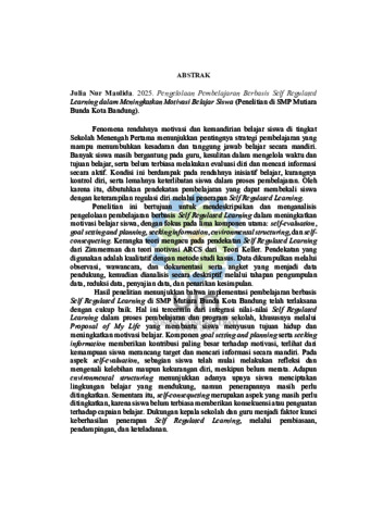 Maulida, Julia Nur (2025) Pengelolaan pembelajaran berbasis Self Regulated Learning dalam meningkatkan motivasi belajar siswa: Penelitian di SMP Mutiara Kota Bandung. Masters thesis, UIN Sunan Gunung Djati Bandung.