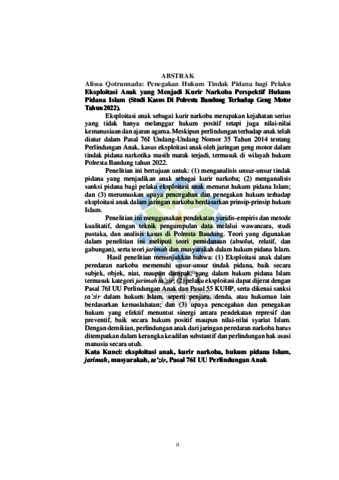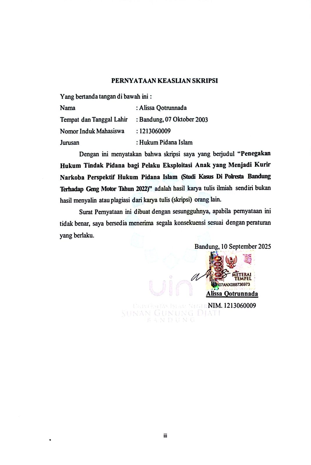 Qotrunnada, Alissa (2025) Penegakan hukum tindak pidana bagi pelaku eksploitasi anak yang menjadi kurir narkoba perspektif hukum pidana Islam: Studi kasus di Polresta Bandung terhadap geng motor tahun 2022. Sarjana thesis, UIN Sunan Gunung Djati Bandung.