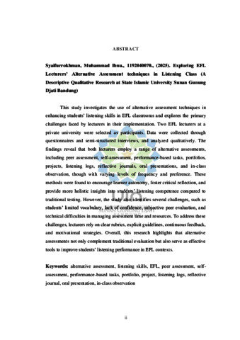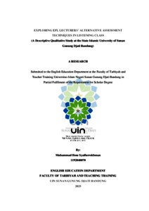Syaifurrokhman, Muhammad Ibnu (2025) Exploring EFL lecturers’ alternative assessment techniques in listening class: A descriptive qualitative study at the State Islamic University of Sunan Gunung Djati Bandung. Sarjana thesis, UIN Sunan Gunung Djati Bandung.