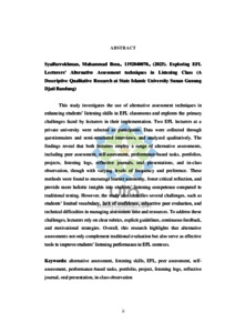 INDONESIA: Penelitian ini mengkaji penggunaan teknik penilaian alternatif dalam meningkatkan keterampilan mendengarkan siswa di kelas bahasa Inggris sebagai bahasa asing (EFL) dan mengeksplorasi tantangan utama yang dihadapi oleh dosen dalam implementasinya. Dua dosen EFL di sebuah universitas swasta dipilih sebagai peserta. Data dikumpulkan melalui kuesioner dan wawancara semi-terstruktur, dan dianalisis secara kualitatif. Hasil penelitian menunjukkan bahwa kedua dosen menggunakan berbagai teknik penilaian alternatif, termasuk penilaian antar teman, penilaian diri, tugas berbasis kinerja, portofolio, proyek, catatan mendengarkan, jurnal reflektif, presentasi lisan, dan pengamatan di kelas, meskipun dengan tingkat frekuensi dan preferensi yang bervariasi. Metode-metode ini ditemukan dapat mendorong kemandirian belajar, memfasilitasi refleksi kritis, dan memberikan wawasan yang lebih holistik tentang kemampuan mendengarkan siswa dibandingkan dengan ujian tradisional. Namun, penelitian ini juga mengidentifikasi beberapa tantangan, seperti kosakata siswa yang terbatas, kurangnya kepercayaan diri, penilaian teman sebaya yang subjektif, dan kesulitan teknis dalam mengelola waktu dan sumber daya penilaian. Untuk mengatasi tantangan ini, dosen mengandalkan rubrik yang jelas, pedoman yang eksplisit, umpan balik berkelanjutan, dan strategi motivasi. Secara keseluruhan, penelitian ini menyoroti bahwa penilaian alternatif tidak hanya melengkapi penilaian tradisional tetapi juga berfungsi sebagai alat efektif untuk meningkatkan kinerja mendengarkan siswa dalam konteks pembelajaran bahasa Inggris sebagai bahasa asing (EFL). ENGLISH: This study investigates the use of alternative assessment techniques in enhancing students’ listening skills in EFL classrooms and explores the primary challenges faced by lecturers in their implementation. Two EFL lecturers at a private university were selected as participants. Data were collected through questionnaires and semi-structured interviews, and analyzed qualitatively. The findings reveal that both lecturers employ a range of alternative assessments, including peer assessment, self-assessment, performance-based tasks, portfolios, projects, listening logs, reflective journals, oral presentations, and in-class observation, though with varying levels of frequency and preference. These methods were found to encourage learner autonomy, foster critical reflection, and provide more holistic insights into students’ listening competence compared to traditional testing. However, the study also identifies several challenges, such as students’ limited vocabulary, lack of confidence, subjective peer evaluation, and technical difficulties in managing assessment time and resources. To address these challenges, lecturers rely on clear rubrics, explicit guidelines, continuous feedback, and motivational strategies. Overall, this research highlights that alternative assessments not only complement traditional evaluation but also serve as effective tools to improve students’ listening performance in EFL contexts. ARABIC: تبحث هذه الدراسة في استخدام تقنيات التقييم البديلة في تحسين مهارات الاستماع لدى الطلاب في فصول اللغة الإنجليزية كلغة أجنبية، وتستكشف التحديات الرئيسية التي يواجهها المحاضرون في تنفيذها. تم اختيار محاضرين اثنين في اللغة الإنجليزية كلغة أجنبية في إحدى الجامعات الخاصة للمشاركة في الدراسة. تم جمع البيانات من خلال استبيانات ومقابلات شبه منظمة، وتم تحليلها بشكل نوعي. تكشف النتائج أن كلا المحاضرين يستخدمان مجموعة من التقييمات البديلة، بما في ذلك التقييم من قبل الأقران، والتقييم الذاتي، والمهام القائمة على الأداء، والمحافظ، والمشاريع، وسجلات الاستماع، والمذكرات التأملية، والعروض الشفوية، والملاحظة داخل الفصل، وإن كان ذلك بدرجات متفاوتة من التكرار والتفضيل. ووجد أن هذه الأساليب تشجع استقلالية المتعلم، وتعزز التفكير النقدي، وتوفر رؤى أكثر شمولية حول كفاءة الطلاب في الاستماع مقارنة بالاختبارات التقليدية. ومع ذلك، تحدد الدراسة أيضًا العديد من التحديات، مثل محدودية مفردات الطلاب، ونقص الثقة، والتقييم الذاتي من قبل الأقران، والصعوبات التقنية في إدارة وقت التقييم والموارد. لمواجهة هذه التحديات، يعتمد المحاضرون على معايير تقييم واضحة، وإرشادات صريحة، وردود فعل مستمرة، واستراتيجيات تحفيزية. بشكل عام، تسلط هذه الدراسة الضوء على أن التقييمات البديلة لا تكمل التقييم التقليدي فحسب، بل تعمل أيضًا كأدوات فعالة لتحسين أداء الطلاب في الاستماع في سياقات تعليم اللغة الإنجليزية كلغة أجنبية.