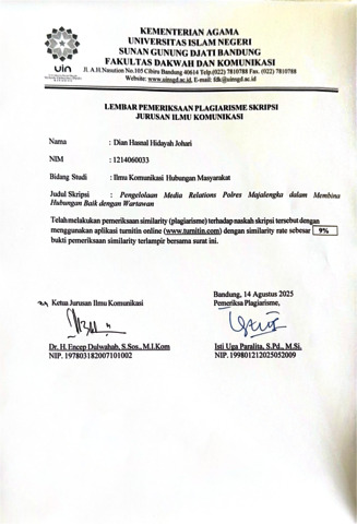 Johari, Dian Hasnal Hidayah (2025) Pengelolaan media Relations Polres Majalengka dalam membina hubungan baik dengan wartawan. Sarjana thesis, UIN Sunan Gunung Djati Bandung.
