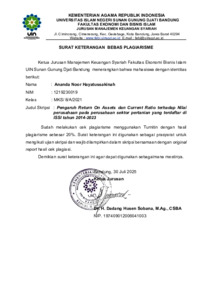 Hayatussakinah, Ananda Noor (2025) Pengaruh Return on Asset dan Current Ratio terhadap nilai perusahaan pada perusahaan sektor pertanian yang terdaftar di ISSI tahun 2014-2023. Sarjana thesis, UIN Sunan Gunung Djati Bandung.
