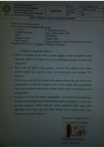 Aziz, M. Syafiq Fauzan (2025) Rancang bangun sistem keamanan di Asrama Pondok Pesantren dengan ESP-32 Cam terintegrasi Whatsapp Messenger. Sarjana thesis, UIN Sunan Gunung Djati Bandung.