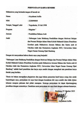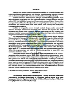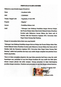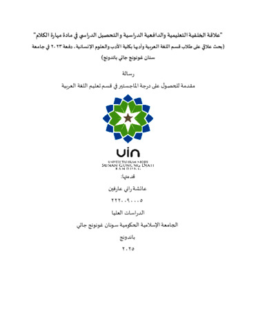 Arifin, Aisyahrani (2024) Hubungan latar belakang pendidikan dengan motivasi belajar dan prestasi belajar dalam mata kuliah Maharah Kalam: Penelitian korelasi pada mahasiswa Jurusan Bahasa dan Sastra Arab di Fakultas Adab dan Humaniora angkatan 2023, Universitas Islam Negeri Sunan Gunung Djati Bandung. Masters thesis, UIN Sunan Gunung Djati Bandung.