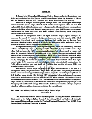 ملخص البحث علاقة الخلفية التعليمية والدافعية الدراسية و التحصيل الدراسي في مادة مهارة الكلام (بحث علاقي على طلاب قسم اللغة العربية وأدبها بكلية الأدب والعلوم الإنسانية، دفعة ٢٠٢٣ في جامعة سنان غونونج جاتي باندونج) تهدف هذه الدراسة إلى معرفة العلاقة بين الخلفية التعليمية والدافعية للتعلم والتحصيل الدراسي في مقرر مهارة الكلام في قسم اللغة والأدب العربي دفعة ٢٠٢٣. أُجريت هذه الدراسة بسبب وجود بعض المشاكل في التعلم، خاصة في القدرة على التحدث باللغة العربية. تم تصميم مقرر مهارة الكلام لتحسين مهارات التحدث لدى الطلاب. استخدمت هذه الدراسة منهج وصفي كمي، حيث بلغ عدد سكان الدراسة ٢٠٧ طلاب وتم اختيار عينة مكونة من ١٠٤ طلاب من قسم اللغة والأدب العربي دفعة ٢٠٢٣. تضمنت تقنيات جمع البيانات الاستبيانات، المقابلات، الاستبيانات، الدراسة المكتبية والاختبارات. تألف الاستبيان من أسئلة تتعلق بالخلفية التعليمية والدافعية للتعلم والتحصيل الدراسي. تم تحليل البيانات باستخدام تحليل الارتباط بيرسون بمساعدة برنامج SPSS. أظهرت نتائج الدراسة أن غالبية المستجيبين جاؤوا من خلفية تعليمية في المدارس الثانوية الإسلامية (٤٥،٢٪)، حيث كانت النسبة الكبرى من التخصص العلمي (٣٣،٧٪)، حوالي ٦٨،٣٪ من المستجيبين لم يتعلموا اللغة العربية من قبل و ٣٢،٧٪ نادراً ما استخدموا اللغة العربية قبل الانضمام إلى برنامج اللغة والأدب العربي. فيما يتعلق بالدافعية للتعلم، شعر ٤٢،٣٪ من المستجيبين بالدافع لتعلم مهارة الكلام بسبب الحاجة والرغبة في التعلم، و ٣٨،٥٪ لديهم اهتمام كبير بتعلم مهارة الكلام، و ٥٨،٧٪ اعتبروا أن دراسة هذا المقرر مهمة لمستقبلهم. الأغلبية ٨٠،٨٪ اعتبروا أنفسهم الدافع الرئيسي لتعلم مهارة الكلام. فيما يخص التحصيل الدراسي، ٨٣،٧٪ من الطلاب دائماً يحضرون الدروس في مقرر مهارة الكلام و ٧١،٢٪ دائماً يقومون بواجبات هذا المقرر. بلغت موثوقية بيانات الدراسة ٠،٣١١ ، مما يشير إلى أن البيانات موثوقة. كان الارتباط بين الدافعية للتعلم والتحصيل الدراسي إيجابياً لكنه ضعيف (٠،٢٤٦، = ٠،٠١٢) مما يشير إلى أن زيادة الدافعية للتعلم مرتبطة بزيادة طفيفة في التحصيل الدراسي. كانت العلاقة بين الخلفية التعليمية والدافعية للتعلم والتحصيل الدراسي ضعيفة وغير معنوية إحصائياً. بلغت قيمةR ٠،٢٩١مما يشير إلى وجود علاقة ضعيفة بين الخلفية التعليمية والدافعية للتعلم والتحصيل الدراسي في مقرر مهارة الكلام في قسم اللغة والأدب العربي دفعة ٢٠٢٣. كانت المساهمة المتزامنة لمتغيري الدافعية للتعلم والتحصيل الدراسي ٨،٥٪ بينما تم تحديد ٩١،٥٪ بواسطة متغيرات أخرى. كانت قيمة الاحتمال ٠،٠١٢، وهي أقل من ٠،٠٥، مما يعني قبول الفرضية الصفرية ورفض الفرضية البديلة، مما يشير إلى وجود علاقة ضعيفة بين الخلفية التعليمية والدافعية للتعلم والتحصيل الدراسي.