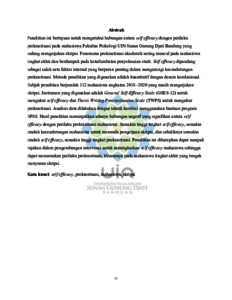 Penelitian ini bertujuan untuk mengetahui hubungan antara self efficacy dengan perilaku prokrastinasi pada mahasiswa Fakultas Psikologi UIN Sunan Gunung Djati Bandung yang sedang mengerjakan skripsi. Fenomena prokrastinasi akademik sering muncul pada mahasiswa tingkat akhir dan berdampak pada keterlambatan penyelesaian studi. Self efficacy dipandang sebagai salah satu faktor internal yang berperan penting dalam mengurangi kecenderungan prokrastinasi. Metode penelitian yang digunakan adalah kuantitatif dengan desain korelasional. Subjek penelitian berjumlah 112 mahasiswa angkatan 2018–2020 yang masih mengerjakan skripsi. Instrumen yang digunakan adalah General Self-Efficacy Scale (GSES-12) untuk mengukur self efficacy dan Thesis Writing Procrastination Scale (TWPS) untuk mengukur prokrastinasi. Analisis data dilakukan dengan teknik korelasi menggunakan bantuan program SPSS. Hasil penelitian menunjukkan adanya hubungan negatif yang signifikan antara self efficacy dengan perilaku prokrastinasi mahasiswa. Semakin tinggi tingkat self efficacy, semakin rendah kecenderungan mahasiswa untuk menunda pengerjaan skripsi, dan sebaliknya semakin rendah self efficacy, semakin tinggi tingkat prokrastinasi. Penelitian ini diharapkan dapat menjadi rujukan dalam pengembangan intervensi untuk meningkatkan self efficacy mahasiswa sehingga dapat menurunkan perilaku prokrastinasi, khususnya pada mahasiswa tingkat akhir yang tengah menyusun skripsi.