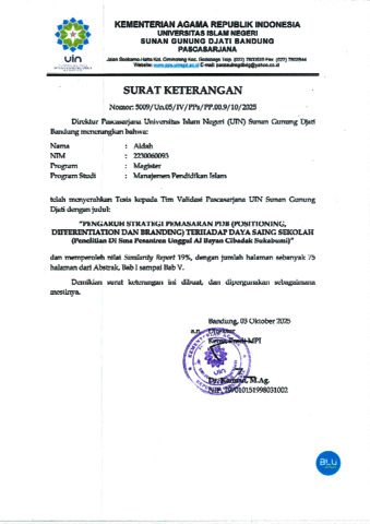 AIDAH, AIDAH (2025) Pengaruh strategi pemasaran PDB (Positioning, Differentiation dan Branding) terhadap daya saing sekolah: Penelitian di SMA Pesantren Unggul Al Bayan Cibadak Sukabumi. Masters thesis, UIN Sunan Gunung Djati Bandung.