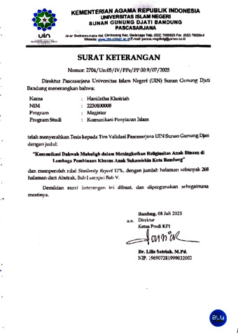 Khoiriah, Hanifathu (2025) Komunikasi dakwah dai dalam meningkatkan religiusitas anak binaan di Lembaga Pembinaan Khusus Anak Sukamiskin Kota Bandung. Masters thesis, UIN Sunan Gunung Djati Bandung.
