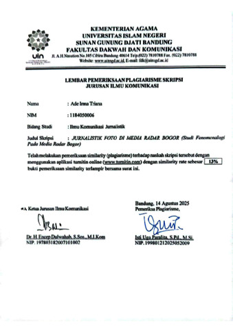 Triana, Ade Irma (2025) Jurnalistik foto di media radar bogor: Studi fenomenologi pada wartawan radar Bogor. Sarjana thesis, UIN Sunan Gunung Djati Bandung.