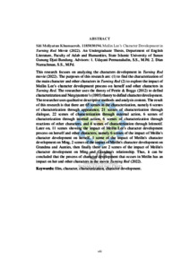 This research focuses on analyzing the characters development in Turning Red movie (2022). The purposes of this research are: (1) to find the characterization of the main character and other characters in Turning Red (2) to explore the impact of Meilin Lee’s character development process on herself and other characters in Turning Red. The researcher uses the theory of Petrie & Boggs (2012) to defind characterization and Nurgiyantoro’s (1995) theory to defind character development. The researcher uses qualitative descriptive methods and analysis content. The result of this research is that there are 65 scenes in the characterization, namely 6 scenes of characterization through appearance, 21 scenes of characterization through dialogue, 22 scenes of characterization through external action, 6 scenes of characterization through internal action, 6 scenes of characterization through reactions of other characters, and 4 scenes of characterization through leitmotif. Later on, 11 scenes showing the impact of Meilin Lee's character development process on herself and other characters, namely 6 scenes of the impact of Meilin's character development on herself, 1 scene of the impact of Meilin's character development on Ming, 2 scenes of the impact of Meilin's character development on Grandma and Aunties, then finally there are 2 scenes of the impact of Meilin's character development on Ming and Grandma's relationship. Thus, it can be concluded that the process of character development that occurs in Meilin has an impact on her and other characters in the movie Turning Red (2022).