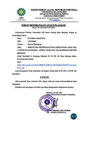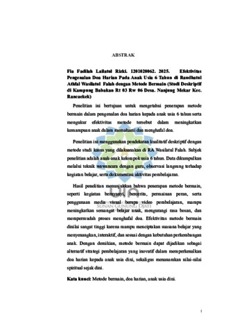 Lailatul Rizki, Fia Fadilah (2025) Efektivitas pengenalan doa harian pada anak usia 6 tahun di raudhatul athfal wasilatul falah dengan metode bermain : Studi deskriptif di kampung babakan RT 03 RW 06, Desa Nanjung Mekar, Kecamatan Rancaekek, Kabupaten Bandung. Sarjana thesis, UIN Sunan Gunung Djati Bandung.