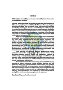 Pelayanan pendaftaran jemaah haji merupakan tahap awal yang sangat penting dalam proses penyelenggaraan ibadah haji. Di Kabupaten Karawang, tingginya antusiasme masyarakat untuk menunaikan ibadah haji menimbulkan tantangan tersendiri bagi penyelenggara, khususnya dalam hal pelayanan publik yang cepat, efisien, dan transparan. Dalam praktiknya, proses pendaftaran masih menghadapi berbagai kendala seperti kurangnya pemahaman masyarakat terhadap alur prosedur, keterbatasan sosialisasi informasi, dan gangguan teknis dalam sistem pelayanan. Oleh karena itu, diperlukan strategi pelayanan yang efektif, terencana, dan adaptif untuk menjawab tantangan tersebut. Penelitian ini bertujuan untuk menganalisis strategi pelayanan pendaftaran jemaah haji di Kantor Kementerian Agama Kabupaten Karawang, yang mencakup tiga aspek utama: bagaimana rencana pelayanan disusun, bagaimana pola pelayanan dijalankan secara operasional, serta bagaimana perspektif organisasi terhadap pelayanan tersebut dibentuk. Penelitian ini menggunakan teori strategi dari Henry Mintzberg yang terdiri dari lima pendekatan strategi, yaitu strategi sebagai rencana (plan), taktik (ploy), pola (pattern), posisi (position), dan perspektif (perspective). Teori ini digunakan sebagai landasan dalam memahami bagaimana strategi pelayanan dirancang dan dijalankan oleh instansi pelayanan publik agar mampu memberikan layanan yang optimal kepada masyarakat. Dalam penelitian ini digunakan paradigma konstruktivisme dengan pendekatan kualitatif dan metode deskriptif. Data diperoleh melalui teknik wawancara mendalam, observasi langsung, dan dokumentasi. Penelitian ini melibatkan tiga kelompok informan utama, yaitu kepala seksi PHU dan staff pelayanan. Teknik analisis data yang digunakan mencakup reduksi data, penyajian data, serta penarikan kesimpulan dan verifikasi melalui triangulasi sumber untuk menjaga keabsahan data yang diperoleh. Hasil penelitian menunjukkan bahwa strategi pelayanan pendaftaran yang diterapkan di Kantor Kementerian Agama Kabupaten Karawang dari segi perencanaan, kantor telah menerapkan langkah strategis melalui rapat koordinasi dan pemanfaatan SISKOHAT, meskipun sosialisasi masih perlu ditingkatkan. Dari pola pelayanan, petugas menunjukkan profesionalitas dengan sistem antrean tertib, namun belum memiliki prosedur alternatif saat terjadi gangguan. Dari perspektif pelayanan, budaya kerja berbasis nilai keikhlasan dan empati menjadi landasan penting dalam membentuk pelayanan yang humanis dan terpercaya.