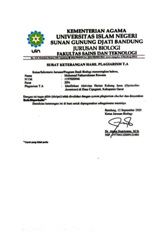 Riswara, Muhamad Fathurrohman (2025) Identifikasi aktivitas harian Kukang Jawa (Nycticebus javanicus) di desa Cipaganti, Kabupaten Garut. Sarjana thesis, UIN Sunan Gunung Djati Bandung.