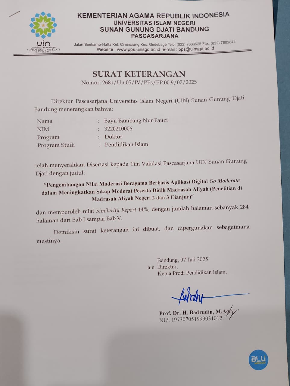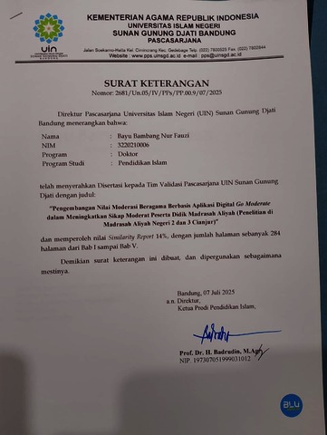 Nur Fauzi, Bayu Bambang (2025) Pengembangan nilai moderasi beragama berbasis aplikasi Digital Go Moderate dalam meningkatkan sikap moderat peserta didik madrasah aliyah: Penelitian di Madrasah Aliyah Negeri 2 dan 3 Cianjur. Doktoral thesis, UIN Sunan Gunung Djati Bandung.