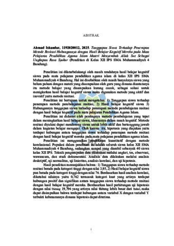 Iskandar, Ahmad (2025) Tanggapan Siswa terhadap penerapan Metode Resitasi hubungannya dengan hasil belajar kognitif mereka pada mata pelajaran Pendidikan Agama Islam materi menyembah Allah SWT sebagai ungkapan rasa syukur : Penelitian di Kelas XII IPS SMA Muhammadiyah 4 Bandung. Sarjana thesis, UIN Sunan Gunung Djati Bandung.