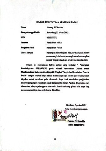 Nuraida, Neneng Ai (2025) Penerapan pembelajaran STEAM-ESD pada topik pemanasan global untuk meningkatkan keterampilan berpikir tingkat tinggi dan kreativitas peserta didik. Sarjana thesis, UIN Sunan Gunung Djati Bandung.