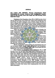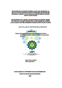 INDONESIA : Pembelajaran Ilmu Pengetahuan Alam (IPA) di SMP Boarding School Zad dan SMP Boarding School Baitul Ilmi Cianjur masih berlangsung secara konvensional dan belum terintegrasi secara sistematis dengan nilai-nilai Al- Qur’an, sehingga belum memberikan kontribusi optimal terhadap pembentukan karakter Islami peserta didik. Padahal, sebagai lembaga pendidikan berbasis Islam, kedua sekolah tersebut memiliki potensi strategis untuk mengembangkan model pembelajaran yang memadukan antara penguasaan ilmu pengetahuan dengan penguatan nilai-nilai keimanan dan akhlak mulia. Tujuan dari penelitian ini adalah untuk menganalisis kebutuhan dan kondisi aktual pembelajaran IPA, Rancangan model, Proses pengembangan model, Implementasi model dan Hasil Evaluasi model pembelajaran IPA berbasis Al-Qur’an untuk meningkatkan karakter Islami siswa di SMP Boarding School Zad Cianjur dan SMP Boarding School Baitul Ilmi Cianjur. Landasan teori dalam penelitian ini terdiri atas tiga pendekatan utama, yaitu teori pendidikan holistik yang menekankan pengembangan siswa secara menyeluruh melalui integrasi antara aspek intelektual, moral, dan spiritual, teori konstruktivisme yang memandang pembelajaran sebagai proses aktif melalui pengalaman dan interaksi sosial, serta konsep karakter Islami yang bersumber dari nilai-nilai Al-Qur’an dan ajaran para tokoh Islam, seperti religiusitas, keteladanan dan tanggung jawab. Metode yang digunakan adalah penelitian dan pengembangan Research and Development (R&D) dengan tahapan yang meliputi studi pendahuluan, perumusan desain model pembelajaran, validasi ahli, uji coba terbatas dan luas, implementasi, serta evaluasi model pembelajaran. Hasil Penelitian ini menunjukkan bahwa pembelajaran IPA di SMP Boarding School Zad dan Baitul Ilmi Cianjur belum mengintegrasikan nilai- nilai Islam secara optimal, sehingga belum maksimal dalam membentuk karakter Islami siswa. Sebagai solusi, dirancang model pembelajaran IPA berbasis Al-Qur’an dengan lima sintaks utama yaitu orientasi Qur’ani, eksplorasi ilmiah, elaborasi makna, refleksi spiritual, dan aksi nyata. Model dikembangkan melalui pendekatan ADDIE (Analysis, Design, Development, Implementation, Evaluation) secara sistematis dan divalidasi oleh para ahli untuk menjamin kesesuaiannya. Model diterapkan di dua SMP Boarding School dan menunjukkan hasil positif berupa peningkatan pemahaman IPA serta penguatan karakter Islami siswa. Evaluasi menunjukkan model ini efektif dan berpotensi direplikasi di sekolah Islam lainnya untuk mengintegrasikan ilmu dan iman dalam pembelajaran. ENGLISH : Science (IPA) learning at SMP Boarding School Zad and SMP Boarding School Baitul Ilmi Cianjur is still conducted conventionally and has not been systematically integrated with Qur’anic values. As a result, it has not contributed optimally to the formation of students' Islamic character. In fact, as Islamic-based educational institutions, both schools have strategic potential to develop a learning model that integrates scientific mastery with the reinforcement of faith and noble character. This study aims to analyze the needs and actual conditions of science learning, design the model, develop the model, implement it, and evaluate a Qur’an-based science learning model to strengthen students’ Islamic character at the two boarding schools. The theoretical foundation of this research is built on three main approaches: (1) holistic education theory, which emphasizes comprehensive student development through the integration of intellectual, moral, and spiritual aspects; (2) constructivist theory, which views learning as an active process through experience and social interaction; and (3) the concept of Islamic character derived from the values of the Qur’an and teachings of Islamic scholars, such as religiosity, exemplary conduct, and responsibility. This study employs a Research and Development (R&D) method with stages including preliminary study, model design formulation, expert validation, limited and broader trials, implementation, and evaluation. The results show that science learning at both schools has not yet optimally integrated Islamic values, thus falling short in fostering students’ Islamic character. As a solution, a Qur’an-based science learning model was developed with five main syntaxes: Qur’anic orientation, scientific exploration, meaning elaboration, spiritual reflection, and real-life action. The model was systematically developed using the ADDIE approach (Analysis, Design, Development, Implementation, Evaluation) and validated by experts to ensure its appropriateness. Implementation in both schools demonstrated positive results in enhancing students' science comprehension and strengthening their Islamic character. The evaluation indicates that the model is effective and has the potential to be replicated in other Islamic schools as an effort to integrate knowledge and faith in the learning process. ARAB : ملخص إيوس لاتيباه، رقم الطالب .3200210011 أطروحة، تطوير نموذج تعليم العلوم الطبيعية ) القائم على القرآن الكريم لتعزيز الشخصية الإسلامية في مدرسة الإقامة المتوسطة زاد جيانتور ومدرسة الإقامة المتوسطة بيت العلوم جيانتور في مدرسة زاد الداخلية ومدرسة بيت العلوم الداخلية في جيانتور لا يزال (IPA) تعليم العلوم الطبيعية يتم بشكل تقليدي ولم يتم دمجه بشكل منهجي مع قيم القرآن، مما أدى إلى عدم تقديم مساهمة مثلى في تكوين الشخصية الإسلامية للطلاب. ومع ذلك، بصفتهما مؤسستين تعليميتين قائمتين على الإسلام، فإن هاتين المدرستين تتمتعان بإمكانيات استراتيجية لتطوير نموذج تعليمي يجمع بي