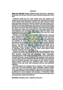 Pelaksanaan ibadah haji tentu selalu memliki risiko yang terkadang kecil nampaknya namun berdampak besar pada rangkaian haji. Kementrian Pusat sebagai instansi tertinggi dalam menjalankan rangkaian tentu sudah mempunyai hukum dalam pelaksanaan ibadah haji di Indonesia. Kebijakan dari hukum tentunya harus dioptimalkan oleh penyelenggara yang salah satunya yakni bagian Penyelenggara Haji dan Umroh di Kemenag Kabipaten Bandung Barat dalam membantu jemaah haji terkhusus haji lansia. Risiko pada administrasi sering terjadi pada rangkaian haji apalagi pada kendala risiko jemaah haj lansia. Masa tunggu menjadi faktor utama banyaknya calon jemaah haji yang usianya menjadi usia lanjut, hal ini mengakibatkan istita’ah pada jemaah menjadi menurun baik secara fisik, mental dirasakan sebagai hingga daya nalar jemaah itu sendiri. Penelitian ini memiliki tujuan untuk mengetahui serta menganalisis bagaimana proses manajemen risiko diterapkan di Seksi Penyelenggaraan Haji dan Umrah Kantor Kementerian Agama Kabupaten Bandung Bara dalam aspek pelaksanaan ibadah haji terutama dalam administrasi haji. Selain hal itujuga yang menjadi tujuan dari penelitian ini secara subjektik kepada jemaah haji lansia, bagaimana penyaringan kuota prioritas haji lansia di Kementrian Agama Kabupaten Bandung Barat ini serta bagaimana keamanan dan kerapihan dalam pengumpulan berkas, dokumen, arsip fisik untuk kebutuhan selama pelaksanaan ibadah haji ini dilaksanakan. Fasilitas teknologi juga menjadi daya tarik dalam tujuan penelitian ini dikarenakan dapat membantu agar lebih efisien kinerja pegawau dalam membantu manajemen risiko itu diterapkan. Penelitian ini berpijak pada teori Fred R. David yang mengungkapkan bahwa manajemen risiko ini bisa dijadikan strategi yang tepat dalam penerapannya seperti harus seni dan pengetahuan dalam merumuskan, menimplementasikan secara strategi tepat hingga kepada evaluasi berkala dalam mengambil Keputusan yang lintas-fungsional yang memapukan sebuah organisasi mencapai kepada tujuannya. Manajemen risiko tentu menjadi hal yang fundamental bagi suatu Perusahaan mengingat segala rangkaian aka nada risikonya tersendiri, apalagi rangkaian ibadah haji yang memerlukan bahan evaluasi penerapan manajemen risiko yang akurat untuk menunjang kesuksesan acara peribadatan didalamnya. Hasil dari penelitian ini menunjukan bahwan manajemen risiko sudah berjalan dengan baik. Hal tersebut dibuktikan dengan terpenuhinya indikator-indikator yakni: 1) Para pegawai senantiasa mengadakan rapat dalam merumuskan masalah. 2) Terjalinnya koordinasi yang baik diantara struktural pusat dan daerah dengan pembahasan dari evaluasi rangkaian haji sebelumnya. 3) Penambahan fasilitas dalam membantu efisiensi kinerja pegawai seperti alat teknologi dan ruangan dalam menyimpan berkas administrasi jemaah haji.