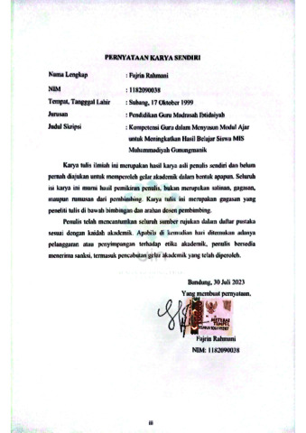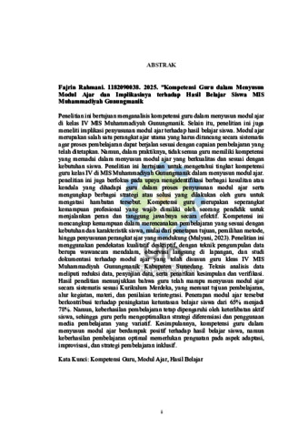 Rahmani, Fajrin (2025) Kompetensi Guru dalam menyusun Modul Ajar dan implikasinya terhadap Hasil Belajar siswa : Penelitian kualitatif terhadap Guru kelas IV MIS Muhammadiyah Gunungmanik Sumedang. Sarjana thesis, UIN Sunan Gunung Djati Bandung.