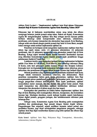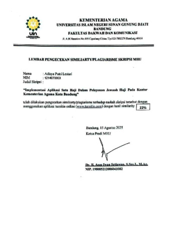 Lestari, Adisya Putri (2025) Implementasi Aplikasi Satu Haji dalam Pelayanan Jemaah Haji pada Kantor Kementerian Agama Kota Bandung Tahun 2024. Sarjana thesis, UIN Sunan Gunung Djati Bandung.