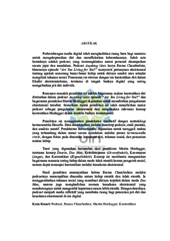 Perkembangan media digital telah menghadirkan ruang baru bagi manusia untuk mengekspresikan diri dan merefleksikan keberadaannya. Salah satu bentuknya adalah podcast, yang memungkinkan narasi personal disampaikan secara jujur dan mendalam. Podcast Anything Goes karya Emma Chamberlain, khususnya episode “Are You Living for You?” menyoroti pertanyaan eksistensial tentang apakah seseorang benar-benar hidup untuk dirinya sendiri atau sekadar mengikuti tekanan sosial. Fenomena ini relevan dengan isu keotentikan diri dalam filsafat eksistensialisme, terutama di tengah budaya digital yang sering mengaburkan jati diri individu. Rumusan masalah penelitian ini adalah bagaimana makna keotentikan diri dituturkan dalam podcast Anything Goes episode “Are You Living for You?” dan bagaimana pemikiran Martin Heidegger digunakan untuk menafsirkan pengalaman eksistensial tersebut. Sementara tujuan penelitian ini ialah menafsirkan narasi podcast sebagai pengalaman eksistensial dan menjelaskan relevansi konsep keotentikan Heidegger dalam konteks budaya kontemporer. Penelitian ini menggunakan pendekatan kualitatif dengan metodologi hermeneutika filosofis. Data dikumpulkan melalui transkrip podcast, studi pustaka, dan analisis naratif. Pendekatan hermeneutika digunakan untuk menggali makna yang terkandung dalam narasi secara mendalam melalui proses hermeneutika circle, dengan fokus pada dinamika kesadaran diri, tekanan sosial, dan pencarian makna hidup. Teori yang digunakan bersumber dari pemikiran Martin Heidegger, terutama konsep Dasein, Das Man, Keterlemparan (Geworfenheit), Kecemasan (Angst), dan Keotentikan (Eigentlichkeit). Konsep ini membantu menguraikan bagaimana manusia sering hidup dalam mode tidak otentik karena pengaruh sosial, namun dapat mencapai keotentikan melalui kesadaran eksistensial. Hasil penelitian menunjukkan bahwa Emma Chamberlain melalui podcastnya menampilkan dinamika antara hidup otentik dan tidak otentik. Ia menggambarkan tekanan sosial yang membuat dirinya terjebak dalam mode Das Man, namun juga menghadirkan momen kesadaran eksistensial yang mendorongnya untuk mengambil keputusan secara lebih otentik. Dengan demikian, podcast menjadi media reflektif yang membuka ruang bagi pencarian jati diri dan kesadaran eksistensial di era digital.