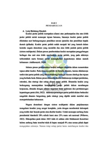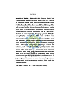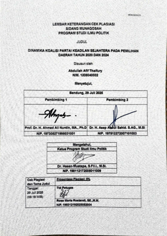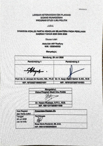 Abdullah Afif Thaifury (1208040002) 2020, Dinamika Koalisi Partai Keadilan Sejahtera Pada Pemilihan Daerah Tahun 2020 dan 2024. Penelitian ini menganalisis dinamika koalisi Partai Keadilan Sejahtera (PKS) dalam Pemilihan Kepala Daerah Kota Depok tahun 2020 dan 2024, dengan fokus pada proses pembentukan, faktor pertimbangan, dan dampaknya terhadap model koalisi. Metode pengumpulan data dilakukan melalui pendekatan kualitatif, termasuk wawancara dengan ketua DPD PKS Kota Depok, observasi, dan studi dokumentasi. Teori yang digunakan adalah office seeking dan policy seeking (Laver, 1998) serta klasifikasi suatu koalisi policy blind coalition dan policy based coalition (Lijphart, 1984), yang menjelaskan motivasi pragmatis dan ideologis dalam pembentukan koalisi. Hasil penelitian menunjukkan bahwa PKS cenderung membangun koalisi berbasis office seeking dengan pertimbangan elektoral dan kekuasaan, seperti pada koalisi tahun 2020 yang efektif, sementara koalisi terbatas dengan Golkar tahun 2024 kurang efektif akibat fragmentasi pemilih dan strategi koalisi lawan. Temuan signifikan lain mengungkap bahwa koalisi PKS bersifat dinamis dan adaptif, tetapi rentan terhadap faktor eksternal seperti stigma politik dan polarisasi elektoral. Penelitian ini juga menegaskan bahwa efektivitas koalisi tidak hanya bergantung pada kuantitas kursi, tetapi juga kemampuan mobilisasi basis pemilih dan kualitas mitra koalisi.