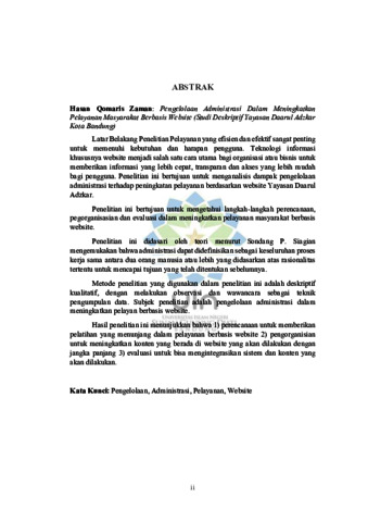 Latar Belakang Penelitian Pelayanan yang efisien dan efektif sangat penting untuk memenuhi kebutuhan dan harapan pengguna. Teknologi informasi khususnya website menjadi salah satu cara utama bagi organisasi atau bisnis untuk memberikan informasi yang lebih cepat, transparan dan akses yang lebih mudah bagi pengguna. Penelitian ini bertujuan untuk menganalisis dampak pengelolaan administrasi terhadap peningkatan pelayanan berdasarkan website Yayasan Daarul Adzkar. Penelitian ini bertujuan untuk mengetahui langkah-langkah perencanaan, pegorganisasian dan evaluasi dalam meningkatkan pelayanan masyarakat berbasis website. Penelitian ini didasari oleh teori menurut Sondang P. Siagian mengemukakan bahwa administrasi dapat didefinisikan sebagai keseluruhan proses kerja sama antara dua orang manusia atau lebih yang didasarkan atas rasionalitas tertentu untuk mencapai tujuan yang telah ditentukan sebelumnya. Metode penelitian yang digunakan dalam penelitian ini adalah deskriptif kualitatif, dengan melakukan observasi dan wawancara sebagai teknik pengumpulan data. Subjek penelitian adalah pengelolaan administrasi dalam meningkatkan pelayan berbasis website. Hasil penelitian ini menunjukkan bahwa 1) perencanaan untuk memberikan pelatihan yang menunjang dalam pelayanan berbasis website 2) pengorganisian untuk meningkatkan konten yang berada di website yang akan dilakukan dengan jangka panjang 3) evaluasi untuk bisa mengintegrasikan sistem dan konten yang akan dilakukan.