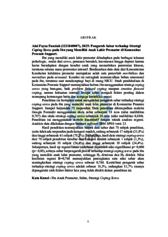 Ibu yang memiliki anak lahir prematur dihadapkan pada berbagai tekanan psikologis, mulai dari stress, perasaan bersalah, kecemasan hingga depresi karena harus beradaptasi dengan kondisi anak yang memerlukan perawatan khusus, terutama selama masa perawatan intensif. Berdasarkan data-data dari Kementerian Kesehatan kelahiran prematur merupakan salah satu penyebab morbiditas dan mortalitas pada neonatal. Kondisi ini seringkali memunculkan beban emosional pada ibu, terutama saat mendampingi bayi di ruang NICU. Studi pendahuluan di Komunitas Preemie Support menunjukkan bahwa ibu menggunakan strategi coping stress yang beragam, baik problem focused coping maupun emotion focused coping, namun kekuatan internal berupa sabar menjadi faktor penting dalam menopang ketenangan batin dan menjaga kestabilan emosi. Penelitian ini bertujuan untuk mengetahui pengaruh sabar terhadap strategi coping stress pada ibu yang memiliki anak lahir prematur di Komunitas Preemie Support. Sampel berjumlah 78 responden. Data penelitian dikumpulkan melalui Google Formulir menggunakan skala sabar sebanyak 18 item (nilai realibilitas 0,787) dan skala strategi coping stress sebanyak 38 item (nilai realibilitas 0,880). Penelitian ini menggunakan metode kuantitatif dengan teknik analisis regresi. Analisis data dilakukan dengan bantuan software IBM SPSS versi 23. Hasil penelitian menunjukkan bahwa data sabar dari 78 subjek penelitian, yaitu tidak ada responden pada kategori rendah, sedang sebanyak 17 subjek (21,8%) dan tinggi sebanyak 61 subjek (78,2%). Sedangkan, hasil data strategi coping stress dari 78 subjek penelitian tersebar dari kategori rendah sebanyak 1 subjek (1,3%), sedang sebanyak 58 subjek (74,4%) dan tinggi sebanyak 19 subjek (24,4%). Selanjutnya, hasil uji regresi linear sederhana diperoleh nilai signifikansi p= 0,000 (p< 0,05), artinya sabar berpengaruh positif terhadap strategi coping stress pada ibu yang memiliki anak lahir prematur, sehingga Ha diterima dan H0 ditolak. Nilai koefisien regresi B=0,768 menunjukkan peningkatan satu nilai sabar akan meningkatkan strategi coping stress sebesar 0,768. Kontribusi pengaruh sabar terhadap strategi coping stress adalah sebesar 18,3%, sedangkan 81,7% sisanya dipengaruhi oleh faktor-faktor lain yang tidak diteliti dalam penelitian ini.