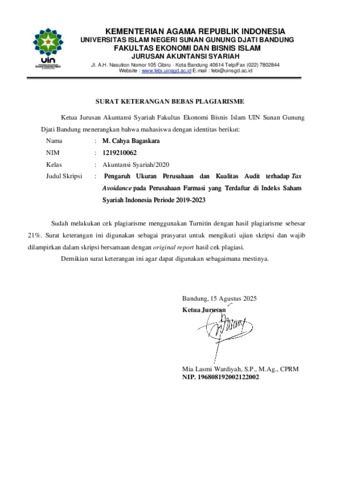Bagaskara, M. Cahya (2025) Pengaruh ukuran perusahaan dan kualitas audit terhadap Tax Avoidance pada Perusahaan farmasi yang terdaftar di Indeks Saham Syariah Indonesia periode 2019-2023. Sarjana thesis, UIN Sunan Gunung Djati Bandung.