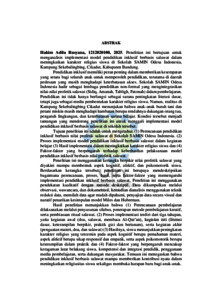 Penelitian ini bertujuan untuk menganalisis implementasi model pendidikan inklusif berbasis salawat dalam meningkatkan karakter religius siswa di Sekolah SAMIN Odesa Indonesia, Kampung Sekebalingbing, Cikadut, Kabupaten Bandung. Pendidikan inklusif memiliki peran penting dalam memberikan kesempatan yang setara bagi seluruh anak untuk memperoleh pendidikan, terutama di daerah pedesaan yang masih menghadapi keterbatasan akses. Sekolah SAMIN Odesa Indonesia hadir sebagai lembaga pendidikan non-formal yang mengintegrasikan nilai-nilai profetik salawat (Sidiq, Amanah, Tabligh, Fatonah) dalam pembelajaran. Pendidikan ini tidak hanya berfungsi sebagai sarana peningkatan literasi dasar, tetapi juga sebagai media pembentukan karakter religius siswa. Namun, realitas di Kampung Sekebalingbing Cikadut menunjukan bahwa anak-anak buruh tani dan petani miskin masih menghadapi hambatan berupa rendahnya dukungan orang tua, pengaruh lingkungan, dan keterbatasan sarana belajar. Kondisi tersebut menjadi tantangan yang mendorong penelitian ini untuk menggali implementasi model pendidikan inklusif berbasis salawat di sekolah tersebut. Tujuan penelitian ini adalah untuk mengetahui: (1) Perencanaan pendidikan inklusif berbasis nilai profetik salawat di Sekolah SAMIN Odesa Indonesia. (2) Proses implementasi model pendidikan inklusif berbasis salawat dalam kegiatan belajar (3) Hasil implementasi dalam meningkatkan karakter religius siswa dan (4) Faktor-faktor yang berpengaruh terhadap keberhasilan pelaksanaan model pendidikan inklusif berbasis nilai profetik salawat. Penelitian ini menggunakan kerangka berpikir nilai profetik salawat yang diyakini mampu membentuk aspek kognitif, afektif, dan psikomotorik siswa. Berdasarkan kerangka tersebut, penelitian ini berupaya mendeskripsikan bagaimana perencanaan, proses, hasil, serta faktor-faktor yang memengaruhi implementasi pendidikan inklusif berbasis salawat. Penelitian ini menggunakan pendekatan kualitatif dengan metode deskriptif. Data dikumpulkan melalui observasi, wawancara, dan dokumentasi, kemudian dianalisis menggunakan teknik reduksi data, memilah data agar mudah dipahami, penyajian data secara visual dan naratif penarikan kesimpulan model Miles dan Huberman. Hasil penelitian menunjukkan bahwa (1) Perencanaan pembelajaran dilaksanakan melalui penyusunan silabus, penerapan metode pembelajaran kreatif, serta pembiasaan ritual salawat. (2) Proses implementasi terdiri dari tiga tahapan, yaitu kegiatan awal (doa, salawat, membaca Al-Qur’an), kegiatan inti (literasi dasar, keterampilan berpikir, praktik gizi dan bertanam), serta kegiatan akhir (penguatan materi, doa, dan salawat) (3) Hasilnya, siswa menunjukkan peningkatan karakter religius yang tercemin pada aspek kognitif berupa pemahaman materi, aspek afektif berupa sikap responsif dan empatik, serta aspek psikomotorik berupa keterampilan dalam praktik dan (4) Faktor-faktor yang berpengaruh mencakup keragaman latar belakang siswa, kompetensi dan integrasi pendidik, penggunaan media pembelajaran, serta dukungan masyarakat. Temuan ini menegaskan bahwa pendidikan inklusif berbasis salawat mampu memberikan kontribusi nyata dalam meningkatkan religiusitas siswa sekaligus membuka harapan baru bagi anak-anak.