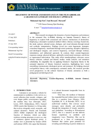 This research investigates the dynamics of power hegemony and resistance in the animated film Ar-Rihlah, drawing on Antonio Gramsci‟s theory of hegemony to explore both consensual and coercive mechanisms of domination. Employing a descriptive-analytical method within a literary sociology framework, the study analyzes selected scenes, dialogue, and visual elements through textual and symbolic interpretation. Findings reveal two main hegemonic strategies: consensual hegemony, manifested through moral posturing, deceptive diplomacy, and ideological imagery; and coercive hegemony, conveyed through violence, intimidation, and militarized spectacle. In contrast, three counter-hegemonic responses emerge: physical defiance, spiritually rooted moral resistance, and divine or supernatural intervention. This study offers interdisciplinary relevance across literary criticism, cultural and Islamic studies, media analysis, and animation scholarship. Its originality lies in applying Gramsci‟s hegemony theory to the animated depiction of Islamic historical narratives, highlighting how visual storytelling communicates ideological power and resistance. By bridging classical sociopolitical theory with contemporary animated media, the research provides novel perspectives on the cultural functions of Islamic animation as both a pedagogical and ideological tool