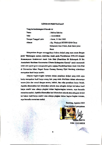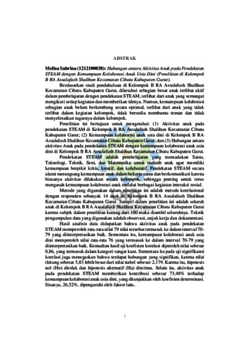 Sabrina, Melisa (2025) Hubungan antara aktivitas anak pada pendekatan STEAM dengan Kemampuan kolaborasi anak usia dini : Penelitian di Kelompok B RA Assalafush Shalihun Kecamatan Cibatu Kabupaten Garut. Sarjana thesis, UIN Sunan Gunung Djati Bandung.