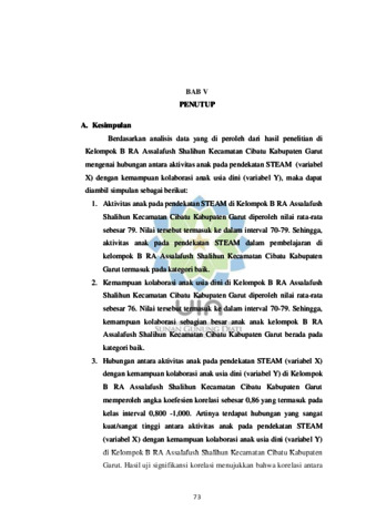 Berdasarkan studi pendahuluan di Kelompok B RA Assalafush Shalihun Kecamatan Cibatu Kabupaten Garut, diketahui sebagian besar anak terlibat aktif dalam pembelajaran dengan pendekatan STEAM, terlihat dari anak yang semangat mengikuti setiap kegiatan dan memberikan idenya. Namun, kemampuan kolaborasi sebagian anak belum berkembang secara optimal, terlihat dari anak yang tidak terlibat dalam kegiatan kelompok, tidak bersedia membantu teman dan tidak menyelesaikan tugasnya dalam kelompok. Penelitian ini bertujuan untuk mengetahui: (1) Aktivitas anak pada pendekatan STEAM di Kelompok B RA Assalafush Shalihun Kecamatan Cibatu Kabupaten Garut; (2) Kemampuan kolaborasi anak usia dini di Kelompok B RA Assalafush Shalihun Kecamatan Cibatu Kabupaten Garut; dan (3) Hubungan antara aktivitas Anak pada pendekatan STEAM dengan kemampuan kolaborasi anak usia dini di Kelompok B RA Assalafush Shalihun Kecamatan Cibatu Kabupaten Garut. Pendekatan STEAM adalah pembelajaran yang memadukan Sains, Teknologi, Teknik, Seni, dan Matematika untuk melatih anak agar memiliki kemampuan berpikir kritis, kreatif, dan kolaboratif. Pendekatan STEAM secara alami merangsang kemampuan anak dalam bekerja sama dan berkomunikasi karena biasanya aktivitas dilakukan secara kelompok, sehingga penting untuk terus mengasah kemampuan kolaborasi anak melalui berbagai kegiatan interaksi sosial. Metode yang digunakan dalam penelitian ini adalah metode korelasional dengan responden sebanyak 14 anak di Kelompok B RA Assalafush Shalihun Kecamatan Cibatu Kabupaten Garut. Sampel dalam penelitian ini adalah seluruh anak di Kelompok B RA Assalafush Shalihun Kecamatan Cibatu Kabupaten Garut karena subjek dalam penelitian kurang dari 100 maka diambil seluruhnya. Teknik pengumpulan data yang digunakan adalah observasi, unjuk kerja dan dokumentasi. Hasil analisis data didapatkan bahwa aktivitas anak pada pendekatan STEAM memperoleh rata-rata nilai 79 nilai tersebut termasuk ke dalam interval 70-79 yang diinterpretasikan baik. Sementara itu, kemampuan kolaborasi anak usia dini memperoleh nilai rata-rata 76 yang termasuk ke dalam interval 70-79 yang diinterpretasikan baik. Kemudian hasil uji koefisien korelasi diperoleh nilai sebesar 0,86, yang termasuk dalam kategori sangat kuat. Sementara itu pada uji signifikansi korelasi juga menegaskan bahwa terdapat hubungan yang signifikan, karena nilai thitung sebesar 5,83 lebih besar dari nilai ttabel sebesar 2,179. Karena itu, hipotesis nol (Ho) ditolak dan hipotesis alternatif (Ha) diterima. Selain itu, aktivitas anak pada pendekatan STEAM memberikan kontribusi sebesar 73,48% terhadap kemampuan kolaborasi anak usia dini, yang ditunjukkan oleh koefisien determinasi. Sisanya, 26,52%, dipengaruhi oleh faktor lain.