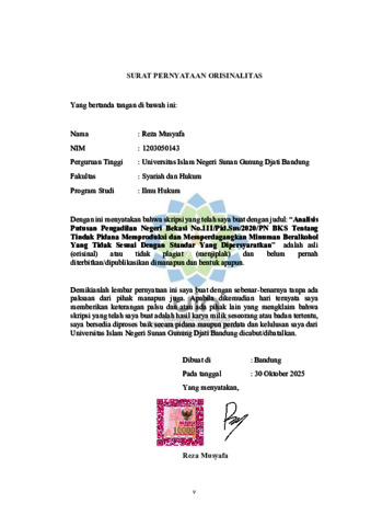 Musyafa, Reza (2025) Analisis putusan pengadilan negeri Bekasi no.111/pid.sus/2020/bks tentang tindak pidana memproduksi dan memperdagangkan minuman beralkohol yang tidak sesuai dengan standar yang dipersyaratkan. Sarjana thesis, UIN Sunan Gunung Djati Bandung.