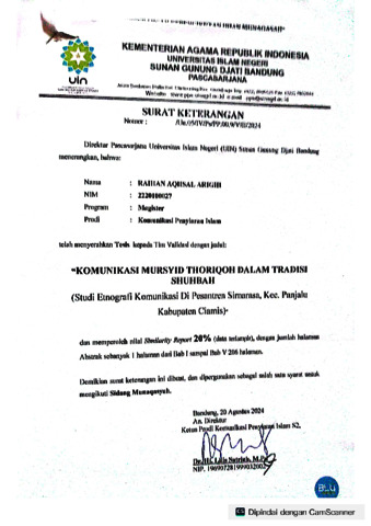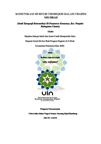 Arighi, Raihan Aqhsal (2024) Komunikasi mursyid thoriqoh dalam tradisi shuhbah: Studi etnografi komunikasi di Pesantren Sirnarasa, Kec. Panjalu, Kab. Ciamis. Masters thesis, UIN Sunan Gunung Djati Bandung.
