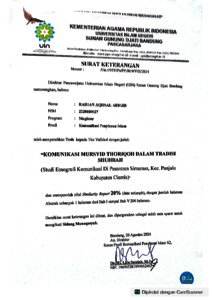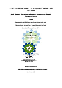 | Uncontrolled Keywords: | Komunikasi Mursyid; Thoriqoh; Tradisi Shuhbah; Etnografi Komunikasi Sirnarasa. |