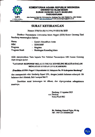 Amin, Guruh Almuslihun (2025) Layanan responsif melalui teknik Konseling Realitas dalam mengatasi korban Love Scamming : Penelitian di SMA Negeri 1 Dayeuhkolot jl. Sukapura no. 99 kabupaten Bandung. Masters thesis, UIN Sunan Gunung Djati Bandung.