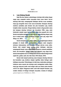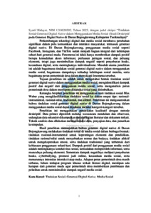 Perkembangan teknologi digital dan media sosial membawa perubahan signifikan dalam pola komunikasi dan interaksi masyarakat, termasuk generasi digital native. Di Dusun Bojongkawung, penggunaan media sosial seperti Facebook, Instagram, dan TikTok sudah menjadi bagian integral dari kehidupan sehari-hari generasi muda. Fenomena ini tidak hanya memberikan dampak positif berupa kemudahan akses informasi, perluasan jaringan sosial, dan peluang ekonomi, tetapi juga menimbulkan dampak negatif seperti penyebaran hoaks, kecanduan digital, serta meningkatnya individualisme. Masalah utama penelitian ini adalah bagaimana tindakan sosial generasi digital native dalam menggunakan media sosial, bagaimana dampaknya terhadap kehidupan sosial mereka, serta bagaimana peran pemerintah desa dalam menyikapi fenomena tersebut. Tujuan penelitian ini adalah untuk mengetahui bentuk tindakan sosial generasi digital native dalam menggunakan media sosial, mengidentifikasi dampak positif dan negatif dari penggunaan media sosial, serta menganalisis peran pemerintah desa dalam merespons dinamika sosial yang ditimbulkan. Kerangka berpikir penelitian ini menggunakan teori tindakan sosial Max Weber yang mengklasifikasikan tindakan sosial ke dalam empat tipe: rasional-instrumental, rasional-nilai, tradisional, dan afektif. Penelitian ini mengasumsikan bahwa tindakan sosial generasi digital native di Dusun Bojongkawung dalam menggunakan media sosial dapat dipahami melalui kategori-kategori tersebut. Penelitian ini menggunakan pendekatan kualitatif dengan metode deskriptif. Data primer diperoleh melalui wawancara mendalam dan observasi, sedangkan data sekunder dikumpulkan melalui kajian literatur dan dokumen terkait. Teknik analisis data dilakukan melalui reduksi data, penyajian data, dan penarikan kesimpulan. Hasil penelitian menunjukkan bahwa generasi digital native di Dusun Bojongkawung melakukan tindakan sosial di media sosial dalam berbagai bentuk: tindakan rasional-instrumental untuk kepentingan ekonomi dan pendidikan, tindakan rasional-nilai untuk menyebarkan norma dan budaya, tindakan afektif untuk mengekspresikan emosi, serta tindakan tradisional yang terbentuk dari kebiasaan penggunaan sehari-hari. Dampak positif dari penggunaan media sosial adalah meningkatnya konektivitas sosial, kemudahan memperoleh informasi, serta munculnya peluang ekonomi. Sementara dampak negatifnya meliputi penyebaran hoaks, cyberbullying, promosi judi online, kecanduan media sosial, serta menurunnya intensitas interaksi tatap muka. Adapun peran pemerintah desa masih terbatas, belum terdapat program khusus terkait literasi digital, meskipun ada harapan dari generasi muda agar pemerintah desa memberikan pembinaan dan pelatihan untuk meminimalisir dampak negatif media sosial.