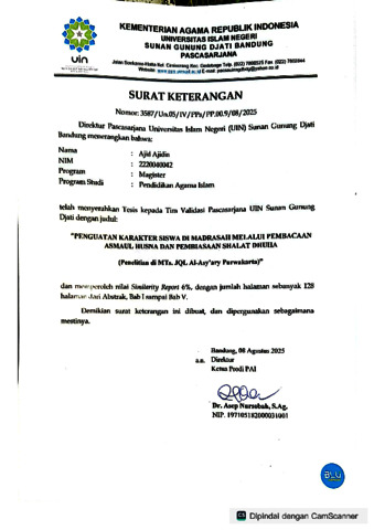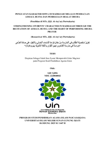 Ajidin, Ajid (2025) Penguatan karakter siswa di madrasah melalui pembacaan Asmaul Husna dan pembiasaan shalat dhuhah: Penelitian di MTs JQL Al-Asy'ary Purwakarta. Masters thesis, UIN Sunan Gunung Djati Bandung.