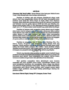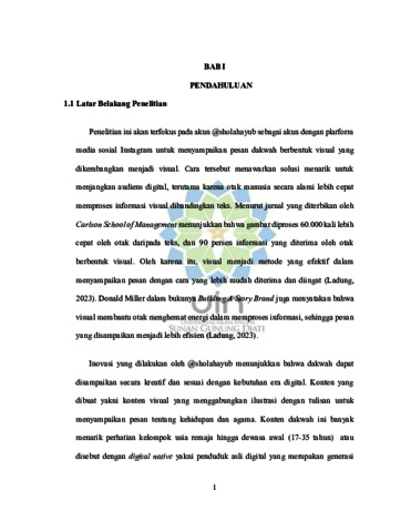 Penelitian ini berfokus pada akun Instagram @sholahayub sebagai media dakwah visual yang menggabungkan ilustrasi dan teks untuk menyampaikan pesan keislaman secara kreatif dan relevan dengan era digital. Media sosial, khususnya Instagram, dinilai efektif dalam penyebaran pesan karena 90% informasi yang diterima otak berbentuk visual dan gambar diproses 60.000 kali lebih cepat dibanding teks. Dengan jumlah pengikut sekitar 137 ribu, @sholahayub berhasil menjangkau generasi digital native (17–35 tahun) melalui konten interaktif yang mudah diakses dan diingat. Penelitian ini bertujuan untuk menganalisis strategi dakwah yang di terapkan dalam konten visual di instagram, meliputi aspek (Plan) perencanaan dalam membuat konten dakwah visual, taktik (Ploy) dalam menarik perhatian dan menarik keterlibatan audiens dakwah di media sosial Instagram, pola (Pattern) dalam menyampaikan dakwah melalui konten visual di Instagram, posisi (Position), dakwah di media sosial Instagram dapat menjadi daya tarik ditengah persaingan konten lainnya, dan tanggapan (Perspekitve) followers akun @sholahayub mengenai konten dakwah visual Penelitian ini menggunakan teori 5P Strategi Henry Mintzberg (Plan, Ploy, Pattern, Position, Perspective) untuk menganalisis strategi dakwah visual yang digunakan. Metode penelitian yang dipakai adalah kualitatif deskriptif dengan teknik analisis data berupa reduksi, penyajian, dan verifikasi. Tujuan penelitian meliputi identifikasi perencanaan konten, taktik menarik audiens, pola narasi, posisi kompetitif di Instagram, dan perspektif audiens terhadap konten dakwah yang disajikan. Metode yang digunakan dalam penelitian ini adalah metode kualitatif dengan pendekatan deskriptif interpretatif untuk memahami makna dibalik proses produksi dan penerimaan pesan dakwah. Teknik pengumpulan data meliputu, obsevasi konten, wawancara mendalam dengan kreator akun @sholahayub dan dokumentasi Hasil penelitian menunjukkan bahwa @sholahayub secara konsisten menerapkan pola narasi mendalam namun ringkas, memanfaatkan kekuatan visual untuk meningkatkan keterlibatan, dan menempatkan dirinya sebagai akun dakwah yang relevan di tengah persaingan konten digital. Strategi ini terbukti efektif dalam menyampaikan pesan dakwah, dengan bertujuan untuk mengajak manusia kepada kebaikan dengan pendekatan yang adaptif terhadap perkembangan teknologi dan preferensi audiens.